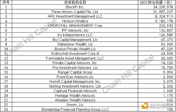 23家持倉機構里有部分機構旗下多只產品分散持有灰度比特幣信托,一共有29個機構級賬戶持有信托份額。