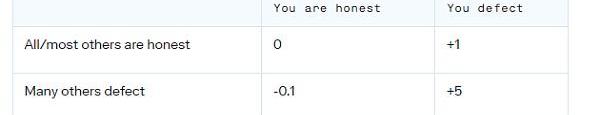 我們可以用一個回報矩陣來通俗地描述每種情況,其中"缺陷"意味著"下載并使用執行反欺詐的軟件"。報酬是"短視"的,沒有考慮到長期后果。