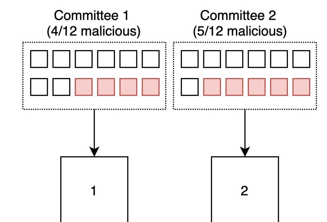 為了更好理解為什么是這樣,讓我們看看以下這個例子:有2個slot和24名驗證者,其中9名是惡意的。驗證者被分成2個委員會,經過隨機混洗,對手不太可能可以控制他們被分配到的委員會人數的50%,更不能實現重組。