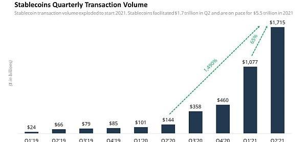 Q2穩定幣的交易額高達1.7萬億美元,同比增長1090%,自第一季度以來增長59%。