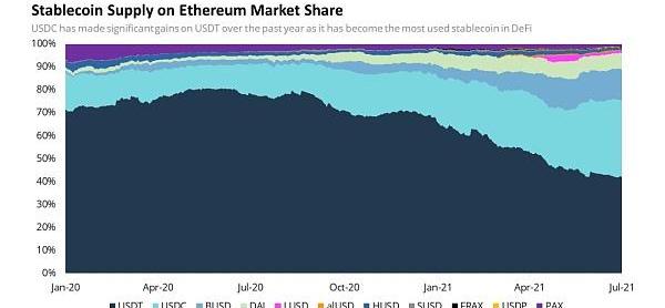 Circle最近宣布了4.4億美元的融資,并計劃以45億美元的價格在SPAC上市,而且還在以太坊蓬勃發展的DeFi生態系統中繼續取得進展。預計USDC將很快超過USDT成為以太坊上占主導地位的穩定幣。