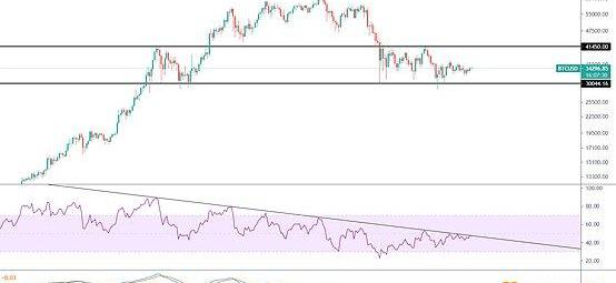 目前行情相對弱勢的原因主要是指標RSI依舊處于今年1月高點回落的下降趨勢線壓制下,只有突破后續才有望震蕩走強,目前在未突破前,先維持區間震蕩,目前這條壓制線已被多次試探,不過每次調整的幅度是越來越小,這表明空頭勢力的逐步衰竭,后續被多頭突破的可能性逐步變大。