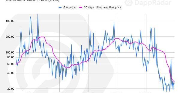 隨著重要變化的臨近,以太坊的Gas費用處于一年來的最低水平。在第一季度,每筆交易的Gas價格浮動在175GWEI左右,可能引發了一些DeFi協議向BSC和Polygon的遷移。而上個月,以太坊的Gas價格已經降至年內低點。
