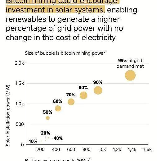 上圖演示了比特幣挖礦可能對太陽能系統普及所產生的影響。假設電力成本不變,上圖演示了太陽能可以提供給電網的電力百分比。y軸是太陽能產生的功率,x軸是電池容量。每個圓圈的大小與比特幣挖礦作業的規模大小成正比。