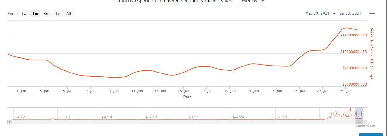 乍看似乎NFT市場出現了斷崖式下跌。但注意,銷售數量本身不具有參考意義,但6月份的以太坊距離5月份蒸發將近一半,而大多數NFT作品以ETH計價,因而綜合銷售數量看,雖然6月份的NFT市場總體不及5月風光,但沒有斷崖式下跌。