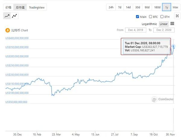 2017年1月1日比特幣市值160億美金,2020年12月1日比特幣市值3600多億美金。這中間差了22倍的市值,就算大資金進場,也很難再漲到20倍去