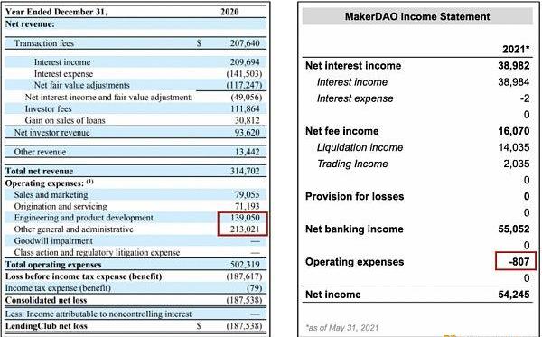 以下是MakerDAO與LendingClub的對比,MakerDAO上線6年后依然能盈利,但是15年后Lendingclub還處于虧損狀態。