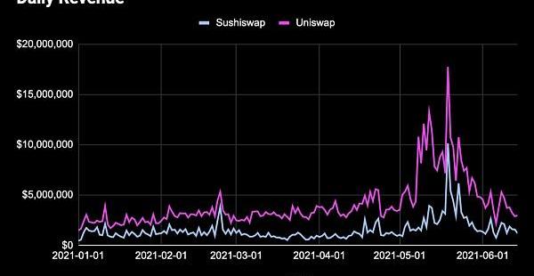 上圖:Uniswap(紅線)和Sushiswap(藍線)今年以來的每日交易費收入變化趨勢。圖源:TokenTerminal