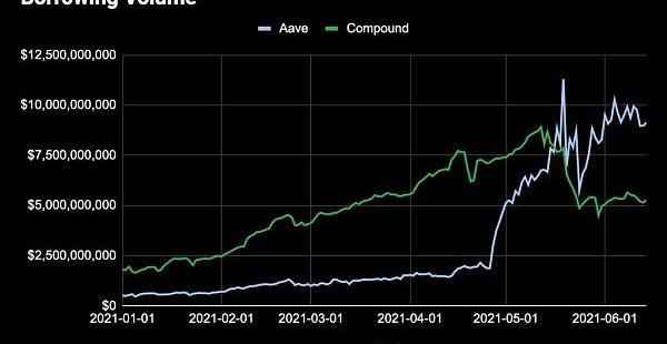 對于Compound和Aave這樣的DeFi借貸協議來說,更多的借款量會為LPs帶來更高的收益率,從而吸引更多的資本,進而提高協議的借款能力(borrowingcapacity)。盡管Compound在借款量方面曾經一直長期領先于Aave,但隨著Aave于2021年5月啟動了一項期待已久的流動性挖礦計劃之后,Compound最近失去了其領先地位。