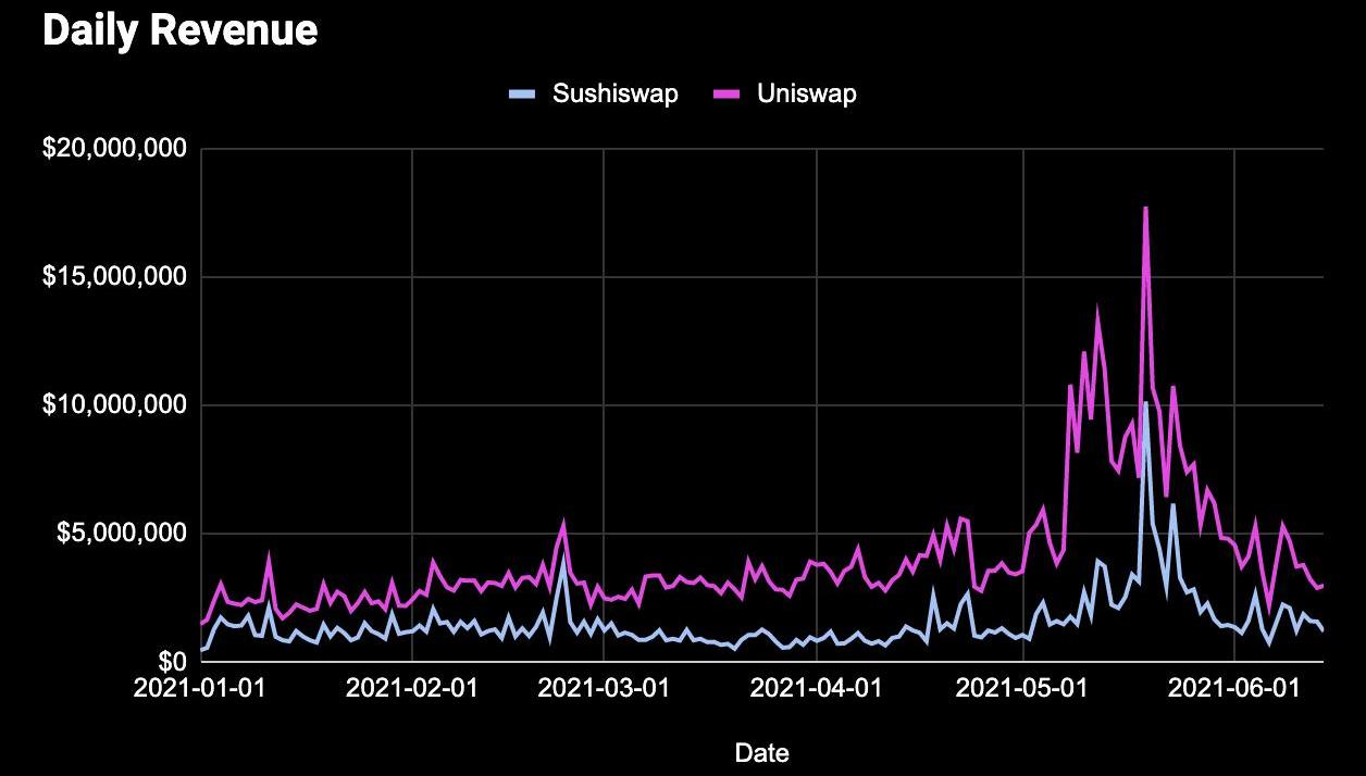 此外,Uniswap從年初至今的收入增長率達到了72%,LP的每日收入達到330萬美元。相比之下,Sushiswap今年的收入僅增長了42%,LP的每日收入為160萬美元。