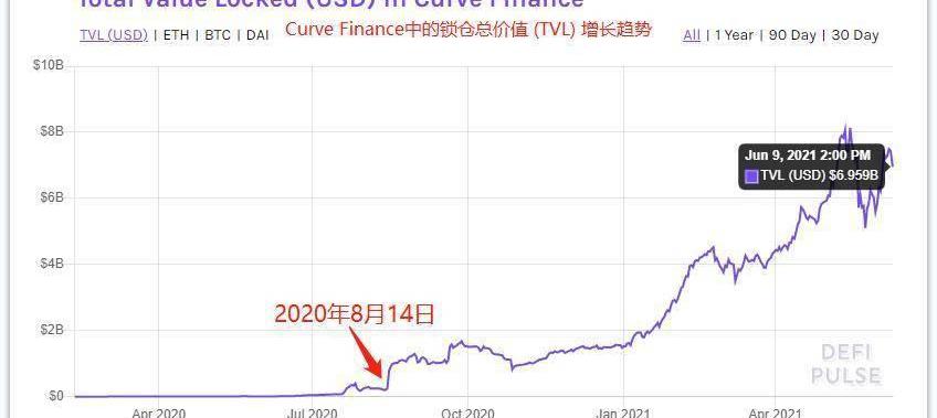 上圖:CurveFinance協議中的鎖倉價值變化。圖源:DeFiPulse