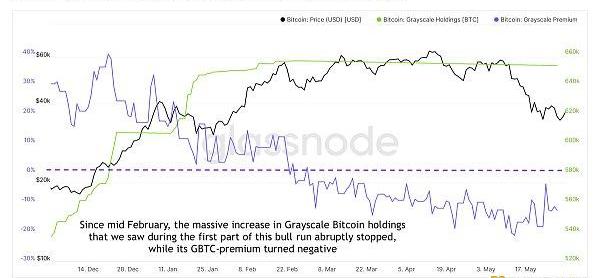 2021年第一季度的其他幾個指標見證了環境的變換。例如,基于機構需求的灰度比特幣信托的比特幣持有量在2021年2月停止增加,而其股票GBTC的溢價實際上變成了負值。