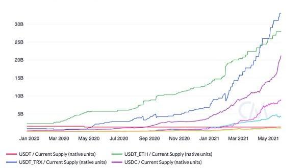 總體而言,就穩定幣的總供應量而言,Tether仍然是領導者。但其他的也在快速增長。自5月12日以來,USDC的供應量增加了60多億,總量超過了200億。