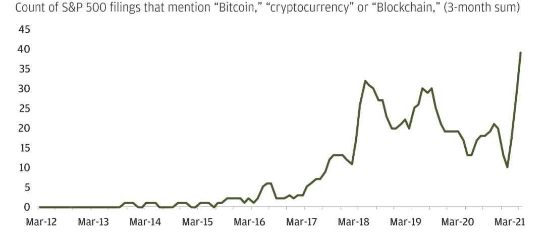 在新冠疫情之后,比特幣的「信徒軍團」在不斷擴大——比特幣錢包的同比增長率從2020年中的27%增加到2021年3月31日的50%。更重要的是,機構投資者也在不斷相信比特幣——這是一個加密資產「被采用」的里程碑,因為機構資本往往具有「粘性」。在2020年對近400家美國機構投資者進行的一項調查中發現,27%的受訪者對數字資產有一定的敞口,高于2019年的22%。。自該調查進行以來,資管公司的操作表明了他們對于加密資產興趣的激增,標普500公司的財報文件中與加密相關的內容也在增加,這使得一些人猜測機構在2021年中會更多采用加密資產。