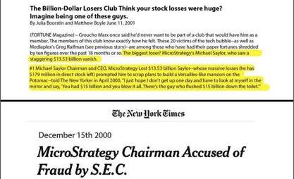 MichaelSaylor本人有一段臭名昭著的歷史。一篇寫于2001年6月的文章將其列為整個互聯網泡沫時期最大的輸家。當時MicroStrategy公司的股價在短短幾個月內從120美元拉升至3,000美元以上,MichaelSaylor也因此聲名大噪。但在后續的泡沫破滅中,其虧損高達135.2億美元,占其凈資產的90%以上。SEC甚至也對其展開了大規模的調查,并就虛假陳述公司狀況對其進行指控。
