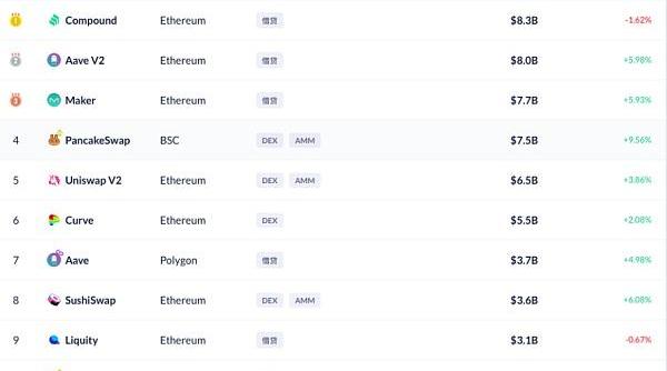 從各類協議的鎖倉量排名表看,Compound以83億美金鎖倉量排名第一。類別上看,借貸和DEX占據主流,在前十鎖倉中分別占據6席和4席。對比去年最大的不同是,前十鎖倉協議中涌現了基于BSC和Polygon鏈的協議面孔,不再是以太坊鏈上協議獨領風騷。
