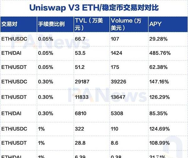 UniswapV3可自定義手續費比例,當前有0.05%、0.3%、1%三檔可選。若通過更低的手續費,使得交易量更大,最終LPs的APY不比其它檔位低,那么很可能吸引LPs選擇0.05%的手續費比例。