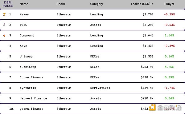 DeFi排名前十鎖倉量 數據來源:DeFi Pluse