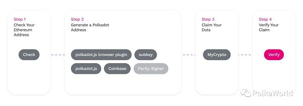 一共四個步驟:檢查以太坊地址 - 生成波卡地址 - 認領 Dot - 確認認領情況。