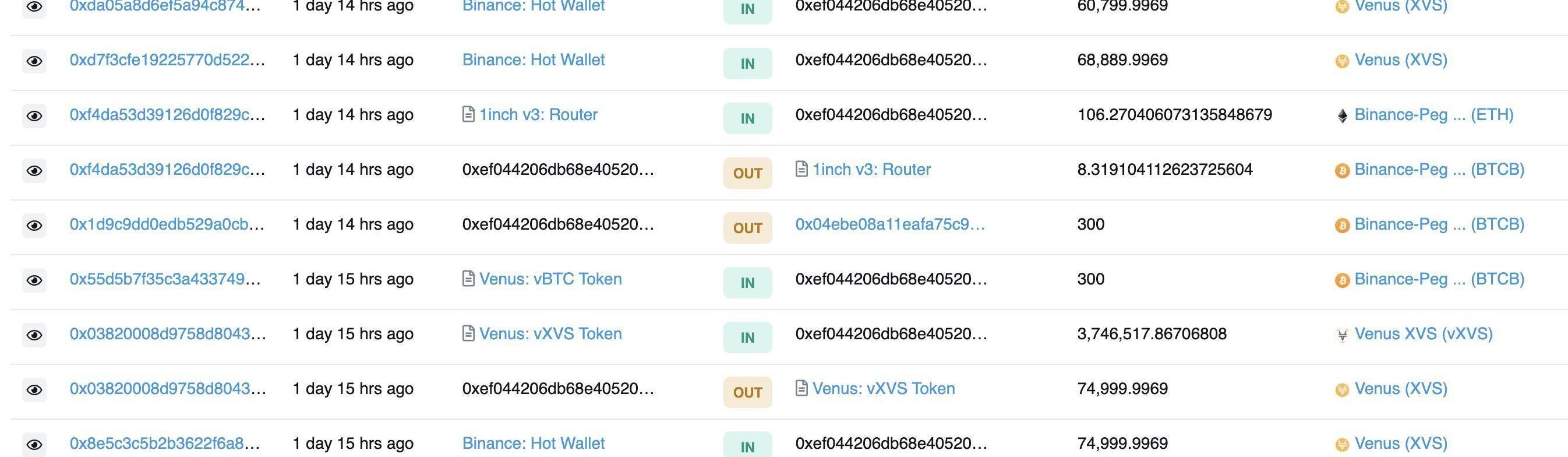 之后便出現4.48億個CAN流入Venus平臺,以0.35美元的價格做抵押,借貸了3000個比特幣和7000個ETH以及其它資產,繼而Venus產生約1億美元的壞賬。