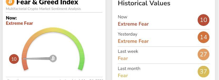 加密資產市場反彈無力,跌幅擴大時,投資者的恐慌情緒不斷加劇。作為加密資產市場「風向標」,比特幣的市場恐慌/貪婪指數往往會反應整個市場的情緒。Alternative數據顯示,5月24日,恐慌/貪婪指數為10,顯示為極度恐慌。一個月前,這個數值為37,尚屬恐慌級別。
