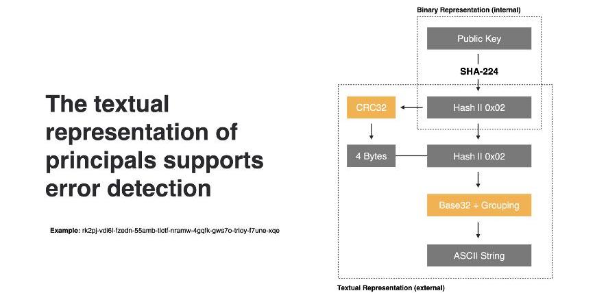以下是關于我們使用的身份格式的一些細節。我們從DER格式的公鑰開始,用SHA-224對其進行散列,從而得到一個28字節的字符串。我們會添加一個字節,用于區分來自公鑰的身份主體和我們在互聯網計算機中其他地方使用的身份主體,例如容器。這29個字節是以用戶委托書的內部二進制表示的。當把一個委托人轉換為其文本表示時,我們首先要預加一個CRC-32錯誤檢測碼。然后,使用Base32編碼產生的字符串,最后建立每組5個字符的組,并用破折號隔開。我們選擇這種格式是為了支持在有適當錯誤檢測的情況下,可以輕松復制粘貼,同時仍然允許ASCII表示法中的字符少于64個,以便與互聯網協議兼容。