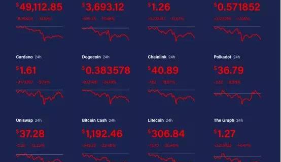 彼時比特幣閃崩也帶動加密貨幣集體大跌。在比特幣跌破5萬美元關口時,瑞波幣跌幅逾15%,以太坊跌超9%至2253美元附近。在比特幣日內暴跌15%時,以太坊暴跌20%,幣安幣暴跌17%,瑞波幣暴跌26%,狗狗幣暴跌19%,萊特幣暴跌28%。