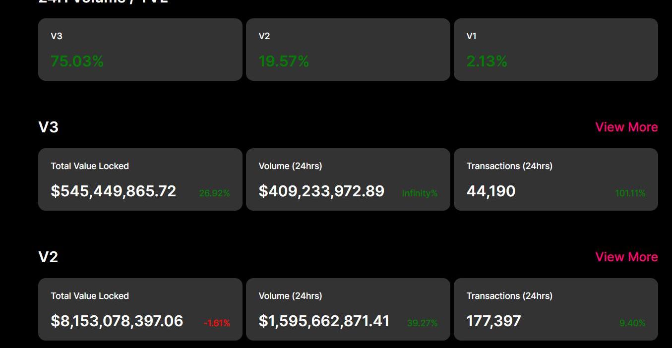 截止奔跑財經發稿時,Uniswap總鎖倉量已經突破5億美元,24小時交易量達4.094億美元。此外,根據UniswapInfo官方數據顯示,UniswapV324小時交易量和鎖倉量比達75.03%,遠超過V2的19.57%。