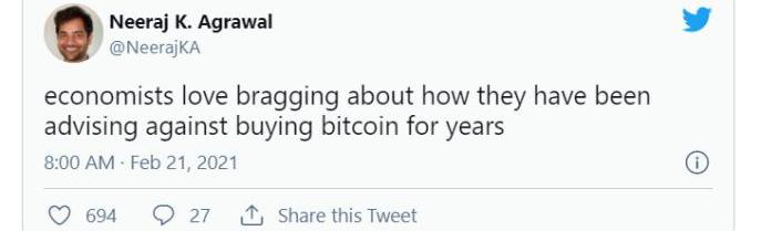 與此相反,主流經濟學家繼續從他們的象牙塔中看待比特幣。諾貝爾經濟學獎得主保羅-克魯格曼、努里爾-魯比尼、史蒂夫-漢克和其他許多人都系統地將比特幣斥為泡沫、郁金香或投機性資產,且很少考慮人們今天是如何實際使用和看待它的。