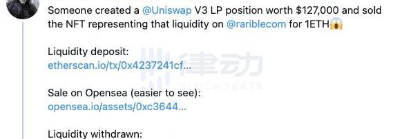 XRP/HKD+2.2%雖然UniswapV3版本已經上線近一周時間了,但是律動Blockbeats發現依然有許多用戶對于V3版NFT的價值與意義不夠了解。以至于近期有用戶在Twitter上爆出了如下慘劇,某用戶以1個ETH的價格,賣掉了手中價值約12.7萬美元的LPNFT頭寸。