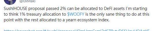 對于Woofy,SushiSwap聯合創始人0xMaki發推表示,SushiSwap近期剛通過了將SushiHOUSE國庫管理資金的2%用于投資DeFi資產的提案,他認為目前將其中1%的資金用于購買WOOFY代幣,其余部分則配給Yearn生態指數是目前市場環境下明智的決定。