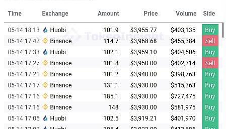 近一個月以來,以太坊上流入的資金已經高達59.3億美元,從小額到大額均出現了明顯的買入流。而截至5月14日18:00,各大主要交易所均出現了大量40萬美元以上的買入多單。