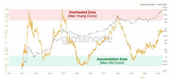 考慮到這種財富轉移,我們可以觀察到老比特幣供應量的比例,并將其與年輕比特幣供應量進行比較。