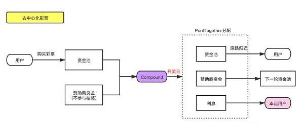 以PoolTogether為例,每一輪初,PoolTogether將購買的資金存入Compound以獲得利息來作為獎金。開獎時隨機選擇一名玩家贏取全部利息,其余本金歸還各位玩家