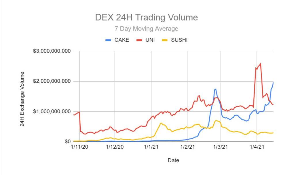 在過去的一年時間里,加密貨幣領域的自動做市商領軍者Uniswap被分叉出來很多項目。PancakeSwap最初是Binance智能鏈上的眾多分叉之一,最近因其交易量和總價值鎖定的大幅上升而備受關注。過去一周,PancakeSwap24小時平均交易量超過了Uniswap,超過了Sushiswap。然而,PancakeSwap的增長受到大量的質疑。本文研究了其增長背后的因素,探討PancakeSwap令人驚訝的差異化產品,并試圖理解這個以“早餐”為主題的巨頭的未來之路。