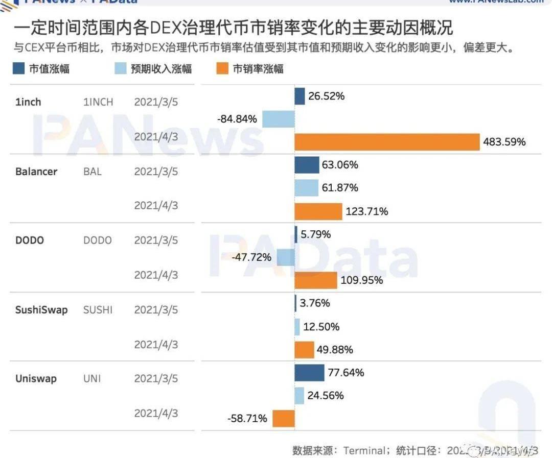但是,與CEX平臺幣估值不同的是,市值和預期收入的變化對DEX治理代幣的市銷率影響非常小,而且偏差較大。