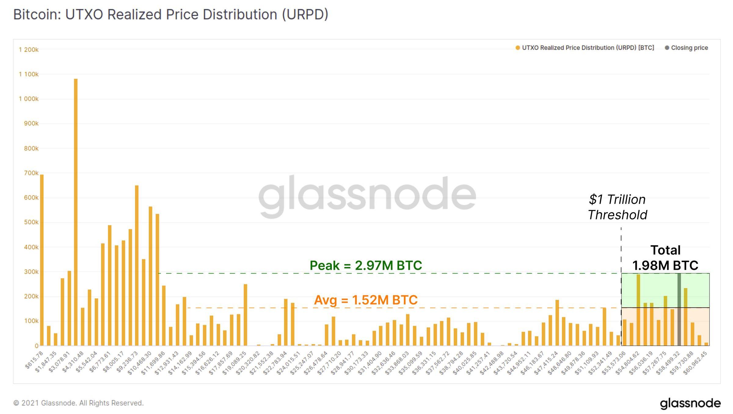這個交易量集群很可能會形成一個非常強大的支撐位,并且似乎在證明比特幣的“1萬億美元”市值是合理的。