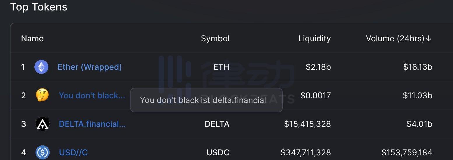 而一個名為「Youdon'tblacklistdeltafinancial」的新代幣也被創建出來,盡管實際流動性不到1美元,但仍創造出了109.6億美元的「交易量」。