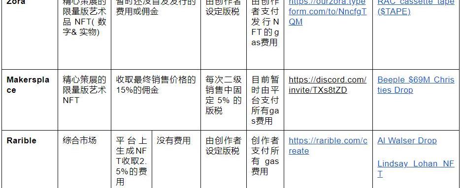 下面的圖表由Spencernoon和ZachChao總結統計完成,對比了7個NFT平臺上發行NFT的情況,包括平臺特色、首次發行費用、二級銷售費用、版稅、gas費誰來支付、發行的申請入口、平臺發行過的NFT代表作品等。本文由藍狐筆記社區的“SEN”翻譯。