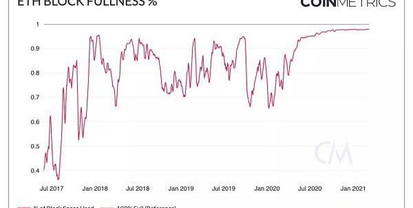 更重要的是,自2020年夏天DeFi興起以來,區塊的容量始終保持在95%或以上。根據CoinMetrics提供的數據,到2021年3月,區塊的平均填充量為97%-98%,完整的區塊會導致網絡擁塞并最終導致高昂的gas費產生。