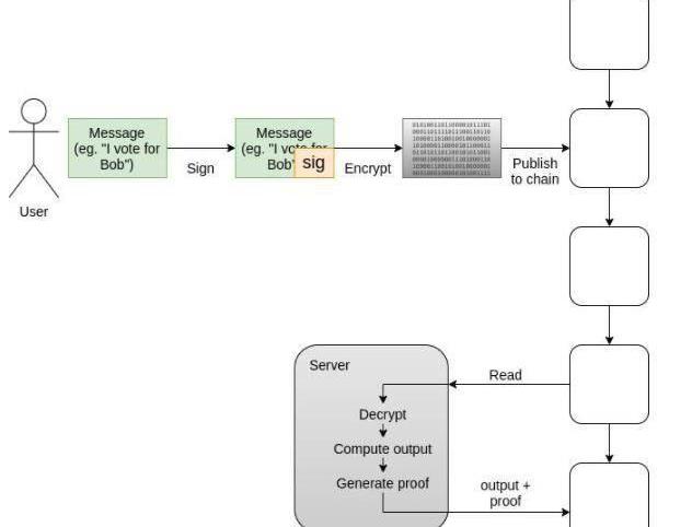 對MACI如何工作的技術描述并不困難。用戶通過使用私鑰對消息簽名,將簽名的消息加密為中央服務器發布的公共密鑰,以及將加密的簽名的消息發布到區塊鏈來參與。服務器從區塊鏈下載消息,對其進行解密,對其進行處理,然后將結果與ZK-SNARK一起輸出,以確保它們正確地進行了計算。