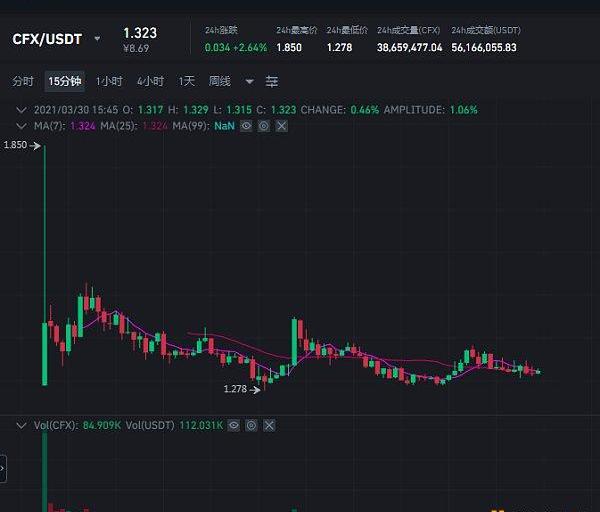 03月29日19:00幣安準時上線CFX,幣安開盤后CFX價格達到1.85USDT,但隨后開始下跌。截止發稿,目前CFX價格在1.3USDT附近。
