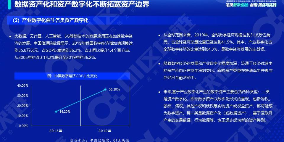 當下,全球數字經濟發展正處于高速推進階段。2019年,全球數字經濟規模達到31.8萬億美元,占全球經濟總量比重已經達到41.5%,數字經濟正在成為主要的經濟形態之一。隨著數字經濟的發展推進,數字資產正逐步展現出它的生命力,成為經濟金融領域最為活躍的資產形態之一,正受到包括政府、市場機構在內的多方主體的高度重視,數字資產在經濟金融市場的價值也日益突出。