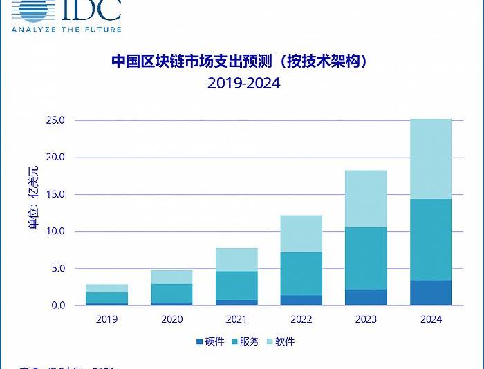 由于中國在疫情防護上的突出表現以及政策加持,IDC預測,中國區塊鏈市場規模將在2021年突破5億美元,并有望在2024年突破25億美元,五年預測數據與上期相比整體上調5%-10%左右,基本恢復至疫情前水平。