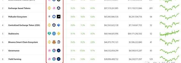它按照熱點板塊來劃分幣種,比如defi、平臺幣、NFT這樣的,還有按不同的生態,比如波卡生態、BSC生態來分組,并顯示每個板塊中目前的龍頭,以及每個板塊整體的漲跌幅,以供大家選擇參考。