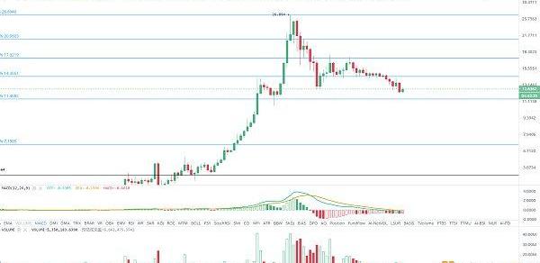 價格新低,指標線已經背離趨勢,下方強支撐11.4美金附近,0.618關鍵支撐和前期突破回踩震蕩支撐區域,預計后續在此迎來反彈的概率大,可以逢低適量布局,短期壓力14.5美金。