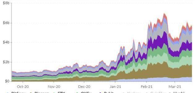 比特幣期貨的統計范圍包括BitMEX、幣安、Bitfinex、Bakkt、Bybit、CME、Deribit、FTX、火幣和OKEx。以太坊期貨的統計范圍包括BitMEX、幣安、Bitfinex、Bybit、CME、Deribit、FTX、火幣和OKEx。