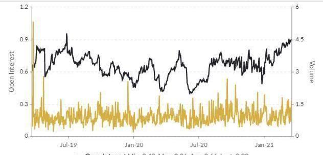 過去一周,比特幣期權成交量也環比增加20%左右至76億美元,持倉數值也緩慢上升,為140億美元左右,持續刷新歷史高點。