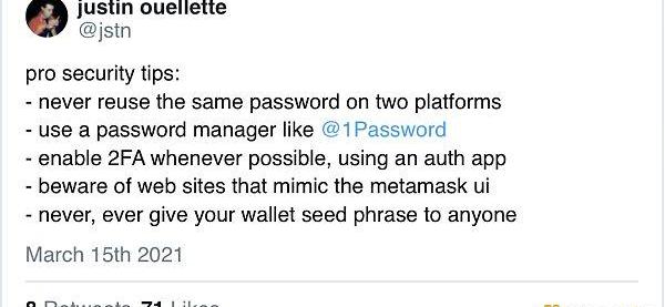 幸運的是,我們可以采取一系列防御措施,保護加密貨幣和NFT資產,免受天才黑客的攻擊。JustinOuellette是一位NFT創作者和收藏家,他在今天早些時候發布了一條推特,介紹了一些基本的保護措施。