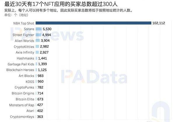 如果將每個地址都看作是一個獨立的買家的話,那么最近30天,有17個NFT應用的買家人數超過300人,其中9個應用的買家人數超過1000人。其中,NBATopShop最近30天的買家人數達到了10.21萬人,是排名第二的Sorare的18倍左右,是排名第17的CryptomonKeys的281倍左右。但是,可能存在多個地址歸屬于同一個買家的情況,因此真實買家總數將大大低于按照地址統計的個數。也就是說,每天有10個及以上真實買家的應用數量僅有10至15個左右。